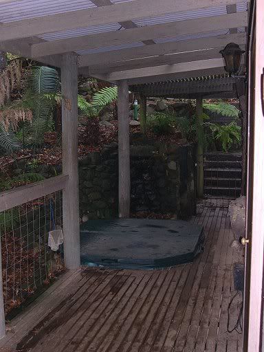 Our private hot tub (I forgot to take the cover off for the photo, but you get the idea), complete with fernery, rock wall and waterfall